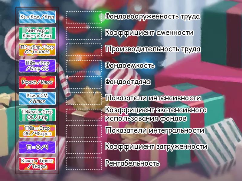 П = О / Ч - Производительность труда, ПФо = 𝑉пр / Стср ОС - Фондоотдача, ПФемк = Стср ОС / 𝑉пр - Фондоемкость, ПФв = Стср ОС / ЧСсрсп - Фондовооруженность труда, ПР = (Бпр / Стср ОС ) х 100% - Рентабельность, Кэкст = Тфакт / Тнорм - Коэффициент экстенсивного использования фондов, Ксм = СМ / Nmax - Коэффициент сменности, Кз = Ксм / Кпл - Коэффициент загруженности, Vфакт / Vmax - Показатели интенсивности, Кинтегр = Кэкст х Кинт - Показатели интегральности,