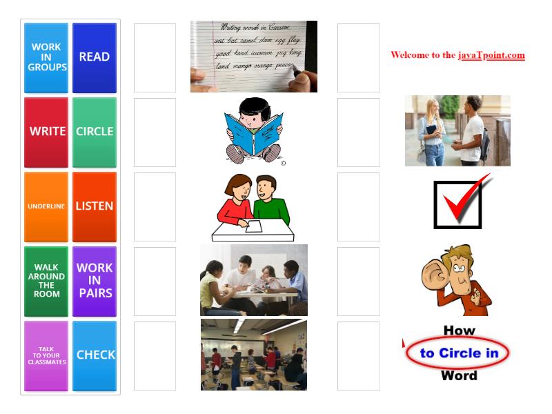 UNDERLINE, CIRCLE, CHECK​, LISTEN, READ, WORK IN PAIRS​, WORK IN GROUPS​, WRITE​, WALK AROUND THE ROOM​, TALK TO YOUR CLASSMATES​,