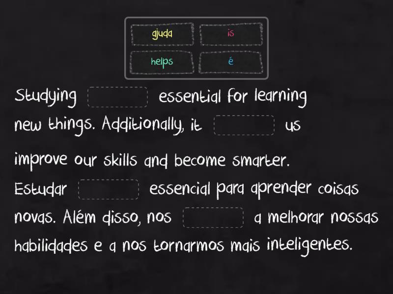 Studying ____ essential for learning new things. Additionally, it ____ us improve our skills and become smarter. Estudar ____ essencial para aprender coisas novas. Além disso, nos ____ a melhorar nossas habilidades e a nos tornarmos mais inteligentes. Furthermore, when we ____ regularly, we ____ information better. Além disso, quando ____ regularmente, ____ melhor das informações. Moreover, it ____ us more confident in class. In addition, studying ____ a way to prepare for tests and do well in school Além disso, nos ____ mais confiantes nas aulas. Além disso, estudar ____ uma forma de se preparar para as provas e ter um bom desempenho na escola. So____ about doing homework; ____ getting better at everything we ____ in school. Então, não se trata apenas de fazer a lição de casa; trata-se de melhorar tudo o que fazemos na escola. Also, ____ a way to show ourselves that we ____ achieve our goals. Além disso, ____ uma forma de mostrar a nós mesmos que ____ alcançar nossos objetivos. Overall, to ____ ____ a super important part of being successful in our learning journey. No geral, ____ ____ uma parte super importante para termos sucesso em nossa jornada de aprendizado.