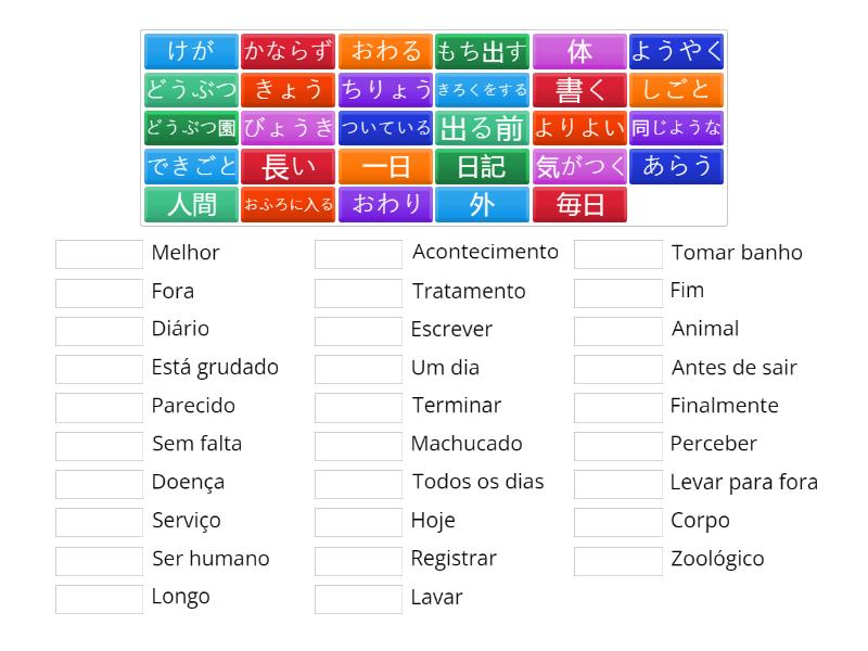 一日 - Um dia, しごと - Serviço, おわり - Fim, きょう - Hoje, できごと - Acontecimento, どうぶつ - Animal, 気がつく - Perceber, 日記 - Diário, 書く - Escrever, 毎日 - Todos os dias, きろくをする - Registrar, 同じような - Parecido, びょうき - Doença, けが - Machucado, よりよい - Melhor, ちりょう - Tratamento, どうぶつ園 - Zoológico, 出る前 - Antes de sair, かならず - Sem falta, おふろに入る - Tomar banho, 体 - Corpo, 人間 - Ser humano, ついている - Está grudado, 外 - Fora, もち出す - Levar para fora, あらう - Lavar, ようやく - Finalmente, 長い - Longo, おわる - Terminar,
