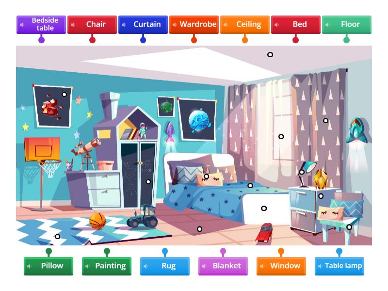 Rug, Bed, Ceiling, Pillow, Blanket, Curtain, Floor, Wardrobe, Bedside table, Table lamp, Chair, Window, Painting.