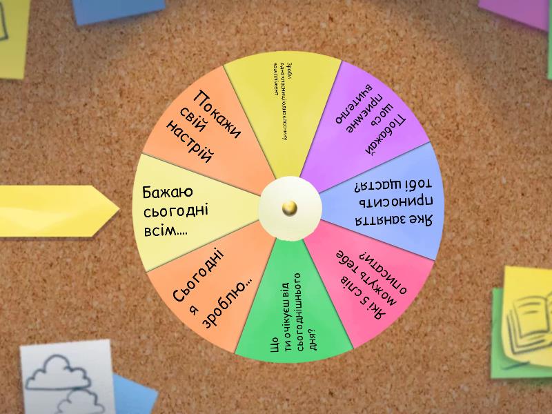 1) Покажи свій настрій 2) Зроби однокласниці/однокласнику комплімент 3) Побажай щось приємне вчителю 4) Яке заняття приносить тобі щастя? 5) Які 5 слів можуть тебе описати? 6) Що ти очікуєш від сьогоднішнього дня? 7) Сьогодні я зроблю... 8) Бажаю сьогодні всім....