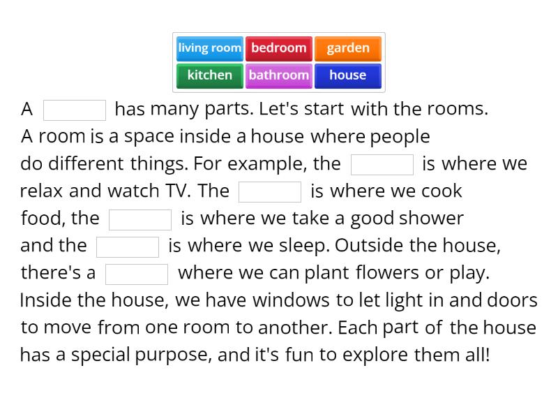 A ____ has many parts. Let's start with the rooms. A room is a space inside a house where people do different things. For example, the ____ is where we relax and watch TV. The ____ is where we cook food, the ____ is where we take a good shower and the ____ is where we sleep. Outside the house, there's a ____ where we can plant flowers or play. Inside the house, we have windows to let light in and doors to move from one room to another. Each part of the house has a special purpose, and it's fun to explore them all!