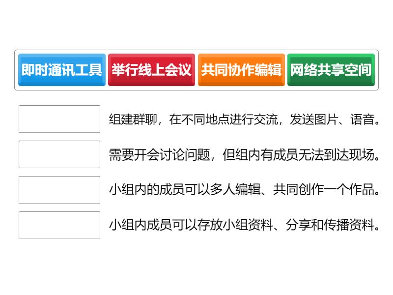 网络共享空间 - 小组内成员可以存放小组资料、分享和传播资料。  , 即时通讯工具 - 组建群聊,在不同地点进行交流,发送图片、语音。, 举行线上会议 - 需要开会讨论问题,但组内有成员无法到达现场。, 共同协作编辑 - 小组内的成员可以多人编辑、共同创作一个作品。  ,