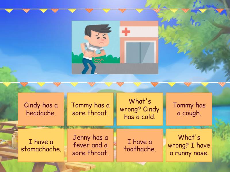 I have a stomachache., Jenny has a fever and a sore throat., What's wrong? Cindy has a cold., I have a toothache., Tommy has a sore throat., Cindy has a headache., What's wrong? I have a runny nose., Tommy has a cough.,