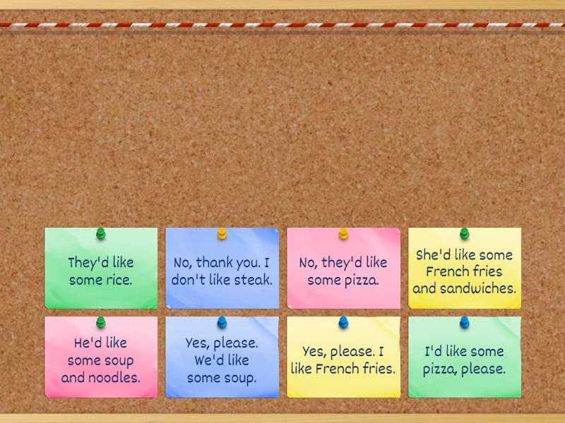 I'd like some pizza, please. - What would you like to eat?, He'd like some soup and noodles. - What would he like to eat?, No, thank you. I don't like steak. - Would you like some steak?, Yes, please. I like French fries. - Would you like some French fries?, They'd like some rice. - What would they like to eat?, No, they'd like some pizza. - Would they like some dumplings?, Yes, please. We'd like some soup. - Would you like some soup?, She'd like some French fries and sandwiches. - What would she like to eat?,