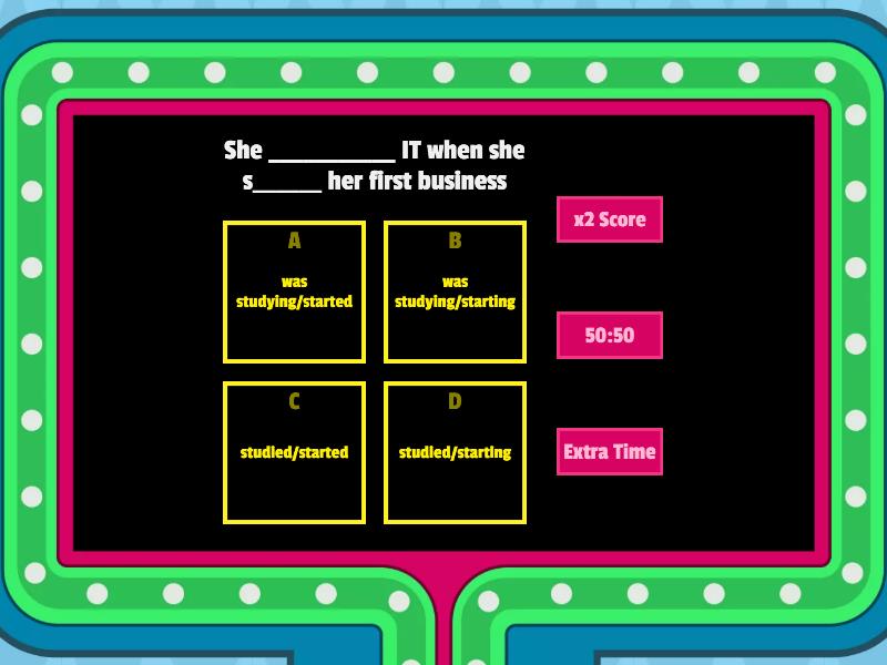 1) She ___________ IT when she s______ her first business a) was studying/started b) was studying/starting c) studied/started d) studied/starting 2) He _____me he wanted to quit his jobwhile we _______ lunch a) told/ were having b) told/ had c) was telling/had d) was telling/ had 3) While I _______ the slides, the eletricity ______ out a) presented/ went out b) presented/ was going out c) was presenting/ went out d) was presenting/ was going out 4) We ____ tired so we ______ to have a break a) got/ decided b) got/ were deciding c) were getting/ decided d) were getting/ were deciding 5) What did you _____ this morning? I ____ to phone you twice a) do/ tried b) do/ was trying c) were you doing/ tried d) were you doing/ was trying