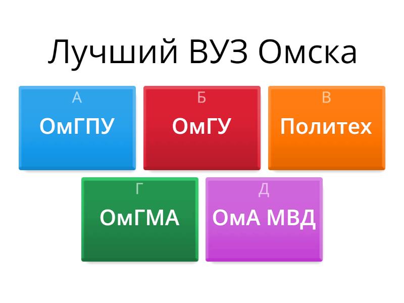 1) Лучший ВУЗ Омска a) ОмГПУ b) ОмГУ c) Политех d) ОмГМА e) ОмА МВД