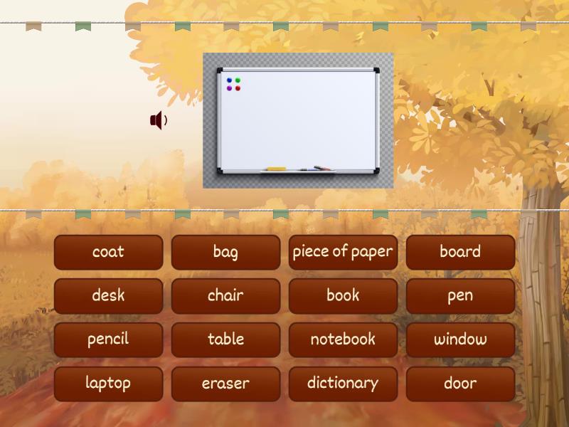 board, door, window, bag, pen, book, chair, coat, table, eraser, laptop, dictionary, piece of paper, pencil, desk, notebook,