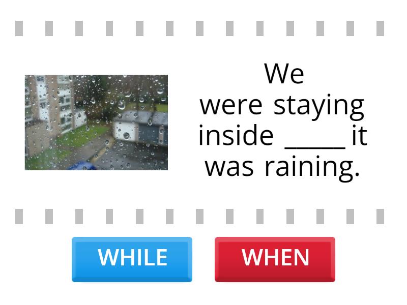 WHILE: We were staying inside _____ it was raining., They were seeing dolphins _____ they were sailing, He was seeing the bear _____ he was walking in the forest., The film was starting _____ Mia was getting some popcorn., WHEN: The dog was running towards me _____ it suddenly stopped, Dorothy was making the cake _____ Tobias arrived., I was surprised _____ I heard the news., Camila was walking home _____ she saw an accident.,