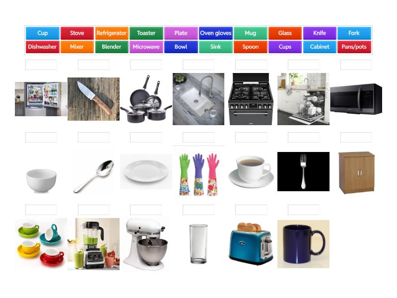 Knife, Spoon, Plate , Bowl, Fork, Cup, Glass, Oven gloves, Mug, Blender, Mixer, Toaster, Pans/pots, Cups, Refrigerator, Microwave, Cabinet, Stove , Dishwasher , Sink,