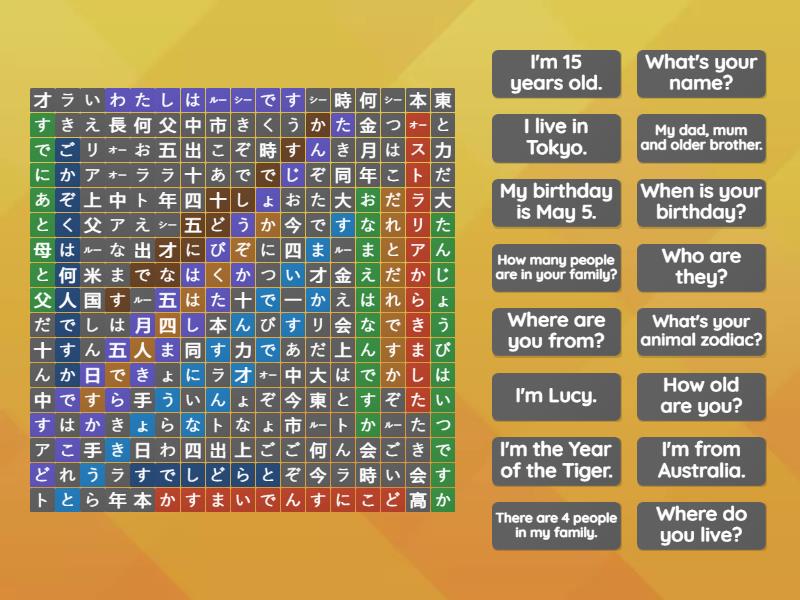 おなまえはなんですか - What's your name?, どこからきましたか - Where are you from?, どこにすんでいますか - Where do you live?, なん才ですか - How old are you?, なにどしですか - What's your animal zodiac?, ごかぞくは何人ですか - How many people are in your family?, だれとだれですか - Who are they?, たんじょうびはいつですか - When is your birthday?, わたしはルーシーです - I'm Lucy., オーストラリアからきました - I'm from Australia., とうきょうにすんでいます - I live in Tokyo., 十五才です - I'm 15 years old., とらどしです - I'm the Year of the Tiger., かぞくは四人です - There are 4 people in my family., 父と母とあにです - My dad, mum and older brother., たんじょうびは五月五日です - My birthday is May 5.,