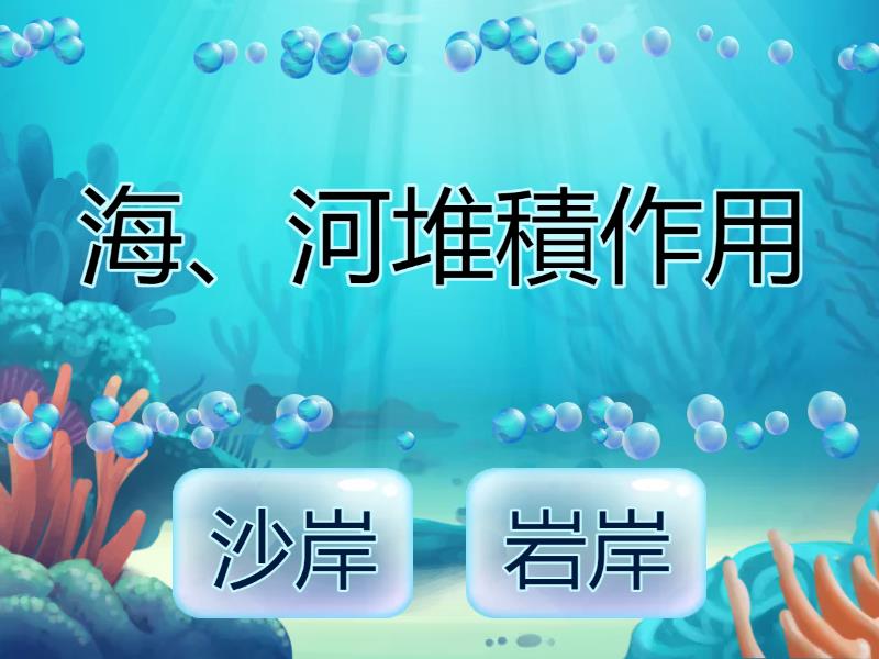 沙岸: 海、河堆積作用, 海岸線平直, 海水比較淺, 沙洲、潟湖, 岩岸: 山地、丘陵相鄰, 海岸線曲折, 海水比較深, 岬角、灣澳,