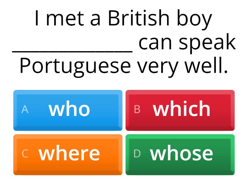 1) I met a British boy _____________ can speak Portuguese very well. a) who b) which c) where d) whose 2) That’s the man _____________ car was stolen. a) who b) which c) that d) whose 3) I met a girl _____________ knows you. a) who b) which c) whose d) when 4) They live in a country _____________ Prime Minister is a woman. a) whose b) where c) which d) that 5) I work in a company _____________ sells things on the Internet. a) who b) which c) that d) whose 6) That’s the film _____________ I saw on TV last Saturday. a) who b) whose c) that d) which 7) She saw the boy _____________ lives next door a) who b) where c) which d) whose 8) I like people _____________ are nice. a) whose b) who c) where d) which 9) She likes films _____________ make her laugh. a) which b) who c) that d) whose 10) The students like books _____________ are easy to read. a) which b) whose c) that d) who 11) I like discos _____________ close late. a) that b) who c) which d) whose 12) This is the reason _____________ I didn’t reply to your e-mail. a) why b) which c) who d) whose 13) Lucia,__________ works in that shop, doesn’t speak English. a) whose b) who c) that d) - 14) That train, _____ leaves at midday, goes to Manchester. a) when b) which c) why d) who 15) Jane, _______ boss is a nightmare, overslept and woke up late. a) who b) which c) whose d) -