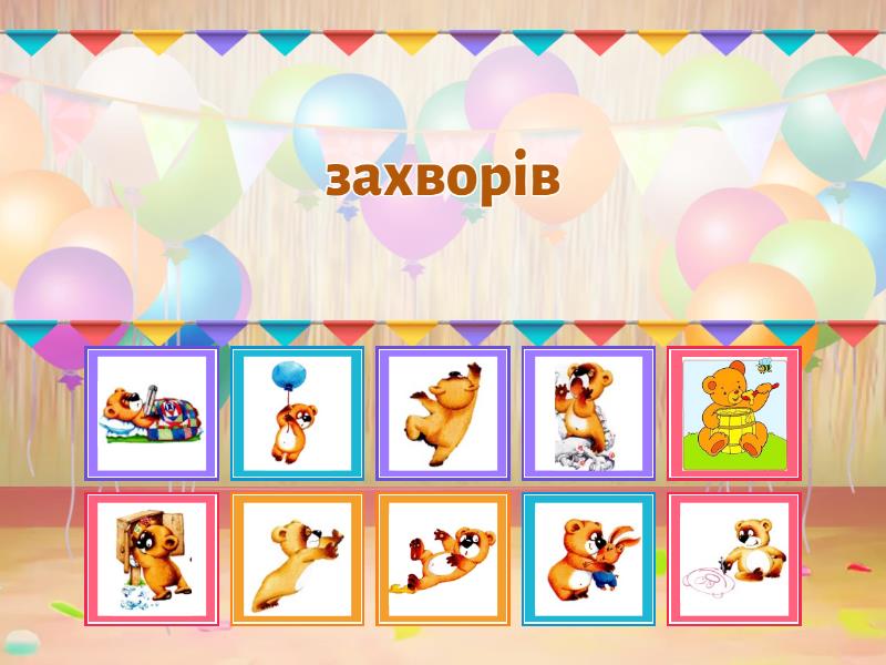 захворів, розбив чашку, летить на кульці, підсковзнувся, падає, сердитий, кричить, малює малюнок, обіймає друга, щось штовхає, кудись лізе, їсть мед,