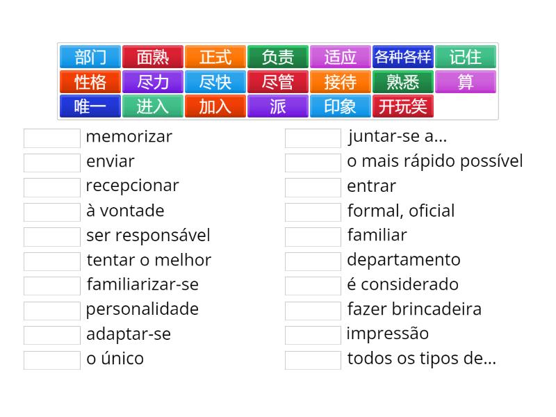 各种各样 - todos os tipos de..., 性格 - personalidade, 开玩笑 - fazer brincadeira, 加入 - juntar-se a..., 正式 - formal, oficial, 负责 - ser responsável, 派 - enviar, 接待 - recepcionar, 尽快 - o mais rápido possível, 熟悉 - familiarizar-se , 进入 - entrar, 部门 - departamento, 算 - é considerado, 尽管 - à vontade, 尽力 - tentar o melhor, 适应 - adaptar-se, 唯一 - o único, 记住 - memorizar, 面熟 - familiar, 印象 - impressão,