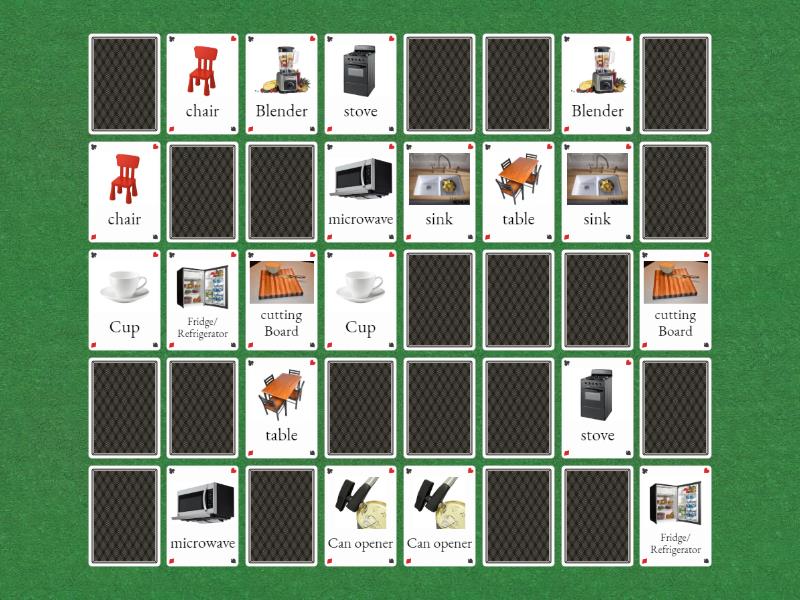 Fridge/ Refrigerator , Blender , stove , table , Can opener, chair , sink, Cup, microwave , cutting Board, dish/plate , glass, Tap/ faucet, Fork, Frying Pan , Ice Tray, Knife, mixer , napkin , oven ,