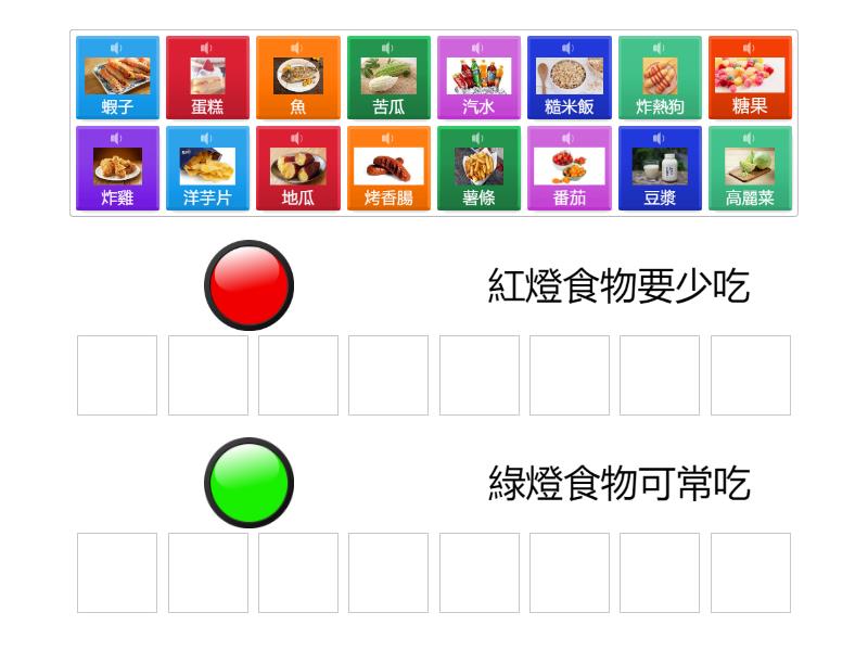 紅燈食物要少吃: 洋芋片, 糖果, 炸熱狗, 汽水, 蛋糕, 薯條, 烤香腸, 炸雞, 綠燈食物可常吃: 番茄, 蝦子, 魚, 豆漿, 高麗菜, 苦瓜, 地瓜, 糙米飯,