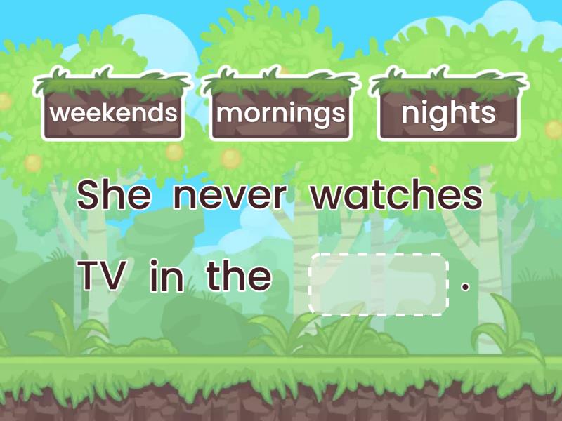 Sally flies her kite ____ the weekend. They have breakfast ____ 7:00 every day. Dad makes popcorn ____. Robert and I go to Italy ____ a year. Ella goes for a walk ____ the afternoons, after she finishes her homework. She never watches TV in the ____. I swim in the summer and in the ____ too. We always go rowing on ____. Harry has a tennis practice ____ a week. I always go to sleep ____ 9:00 at night.