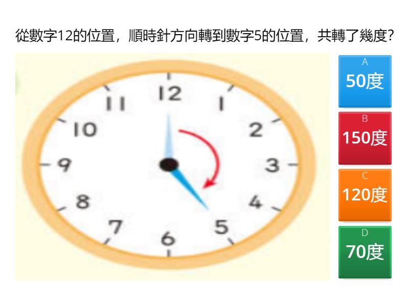 1) 從數字12的位置,順時針方向轉到數字5的位置,共轉了幾度? a) 50度 b) 150度 c) 120度 d) 70度 2) 從數字6的位置,順時針方向轉到數字10的位置,共轉了幾度? a) 40度 b) 120度 c) 60度 d) 100度 3) 從數字12的位置,逆時針方向轉到數字7的位置,共轉了幾度? a) 50度 b) 150度 c) 120度 d) 70度 4) 從數字2的位置,逆時針方向轉到數字9的位置,共轉了幾度? a) 20度 b) 150度 c) 90度 d) 50度 5) 直角是幾度? a) 360 b) 90 c) 180 d) 30 6) 平角是幾度? a) 360 b) 180 c) 90 d) 30 7) 周角是幾度? a) 30 b) 360 c) 180 d) 90 8) 角C和角D能拼成一個平角,角C=72度,角D是幾度? a) 18度 b) 108度 c) 288度 d) 144