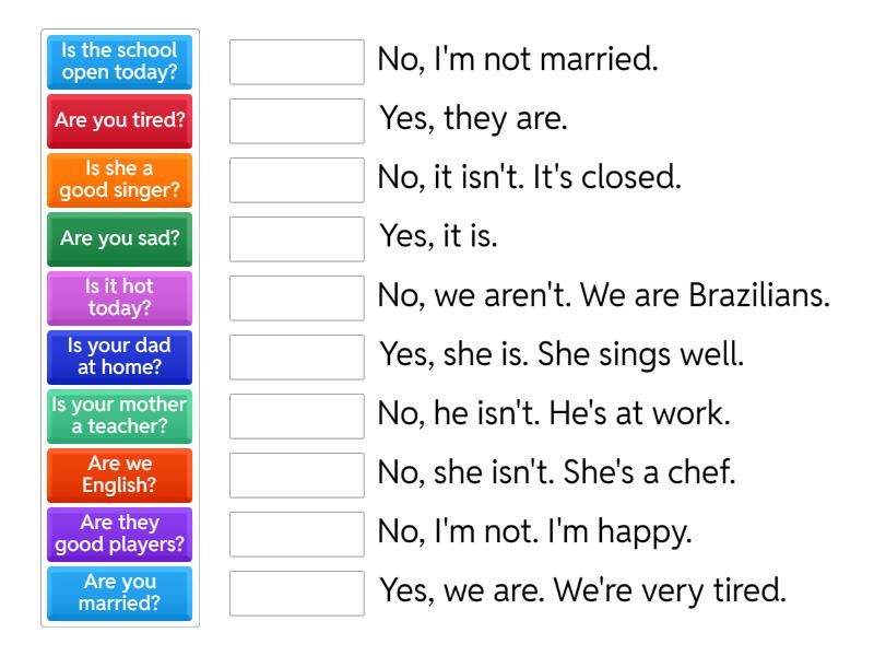 Are you sad? - No, I'm not. I'm happy., Is your dad at home? - No, he isn't. He's at work., Is it hot today? - Yes, it is., Are you married?  - No, I'm not married., Are they good players? - Yes, they are., Is the school open today? - No, it isn't. It's closed., Is she a good singer? - Yes, she is. She sings well., Are you tired? - Yes, we are. We're very tired., Is your mother a teacher? - No, she isn't. She's a chef., Are we English? - No, we aren't. We are Brazilians. ,