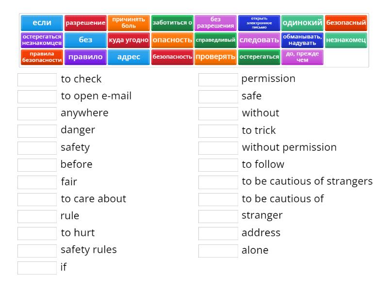 одинокий - alone, куда угодно - anywhere, заботиться о - to care about, остерегаться - to be cautious of, опасность - danger, правило - rule, следовать - to follow, причинять боль - to hurt, разрешение - permission, безопасность - safety, незнакомец - stranger, обманывать, надувать - to trick, без - without, правила безопасности - safety rules, справедливый - fair, без разрешения - without permission, открыть электронное письмо - to open e-mail, остерегаться незнакомцев - to be cautious of strangers, безопасный - safe, адрес - address, до, прежде чем - before, если - if, проверять - to check,