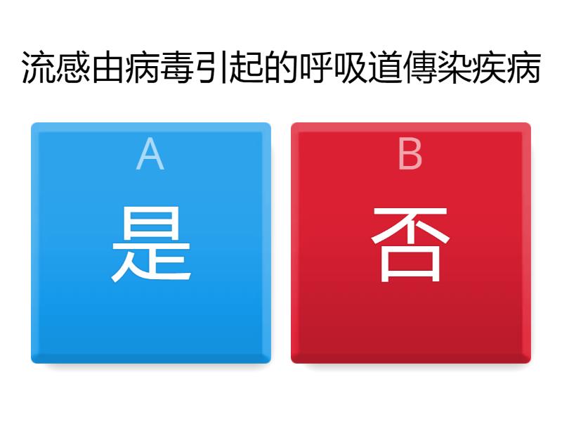 1) 流感由病毒引起的呼吸道傳染疾病 a) 是 b) 否 2) 流感的傳染途徑有哪些 a) 飛沫 b) 念力 c) 接觸 d) 視力 3) 流感跟感冒一樣 a) 是 b) 否 4) 如何預防流感 a) 勤洗手 b) 戴口罩 c) 咳嗽禮節 d) 社交距離 5) 流感好發季節春夏 a) 否 b) 是 6) 得到流感應該來上學 a) 是 b) 否 7) 得到流感應該怎麼做 a) 在家休息 b) 盡早就醫 c) 戴好口罩 d) 跑出去玩 8) 打疫苗是為了保護自己 a) 是 b) 否 9) 打疫苗是為了保護他人 a) 是 b) 否 10) 學校幾號要打流感疫苗? a) 11/01 b) 11/12 c) 11/02 d) 10/31 11) 流感比感冒嚴重 a) 是 b) 否