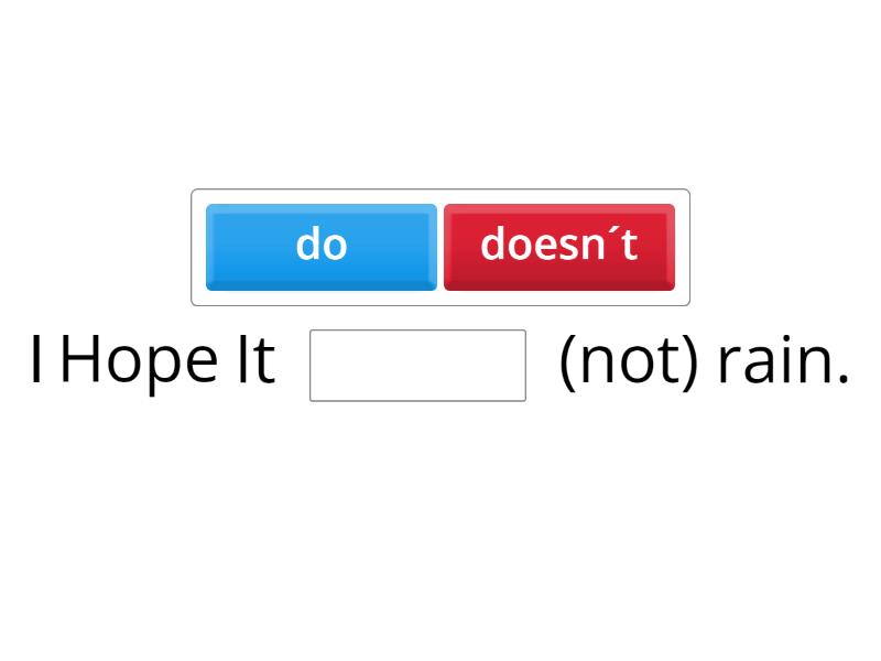I Hope It ____ (not) rain. I Hope Marta ____ the test. I Hope the cake ____ OK. I Hope you ____ better soon. I´m planning to have a barbecue, so I Hope It ____ rain. I can´t celebrante my birthday without you, I Hope you ____ I Hope the cakes ____ good.