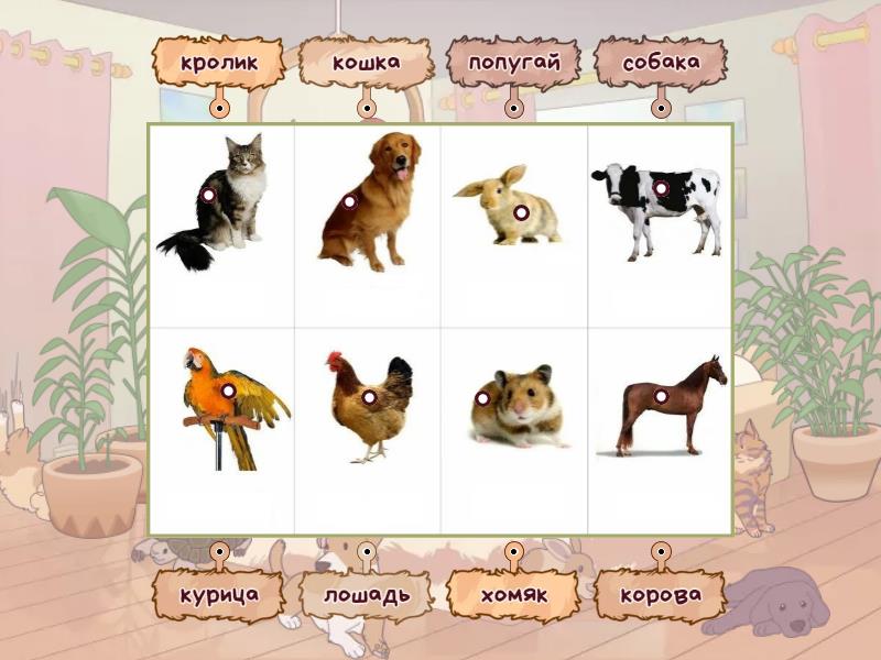 собака, хомяк, корова, кошка, лошадь, попугай, кролик, курица.