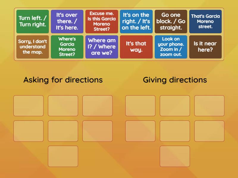 Asking for directions: Where am I? / Where are we?, Sorry, I don't understand the map., Where's Garcia Moreno Street?, Is it near here?, Excuse me. Is this Garcia Moreno Street?, Giving directions: Turn left. / Turn right., It's that way., Go one block. / Go straight., It's on the right. / It's on the left., It's over there. / It's here., That's Garcia Moreno street., Look on your phone. Zoom in / zoom out.,
