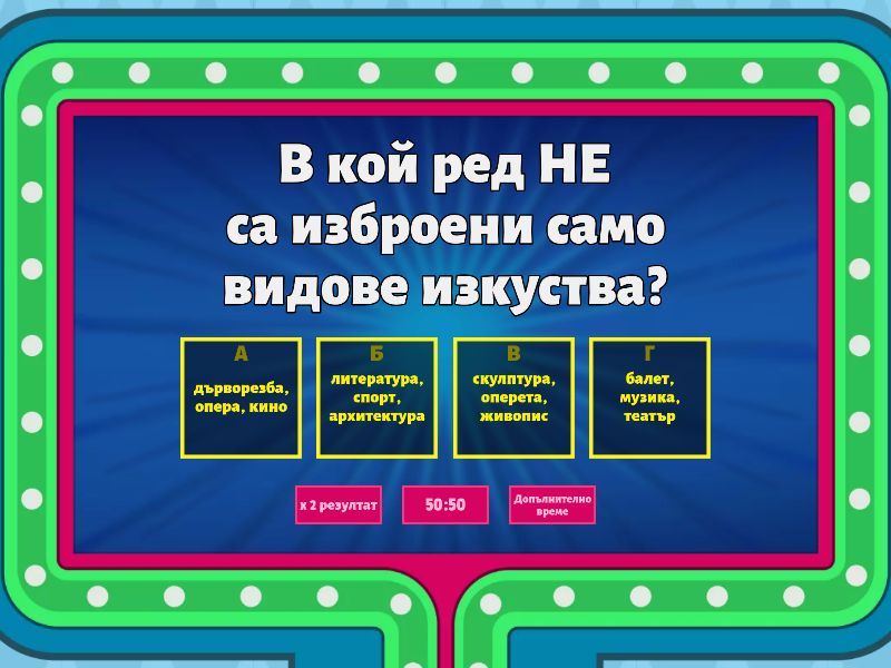 1) В кой ред НЕ са изброени само видове изкуства? a) дърворезба, опера, кино b) литература, спорт, архитектура c) скулптура, оперета, живопис d) балет, музика, театър 2) Посочете НЕВЯРНОТО твърдение за изкуството: a) Изкуството носи на човека радост и наслада от живота. b) Изкуството е творческа художествена дейност. c) Изкуството удовлетворява материалните потребности на човека. d) Изкуството е свързано с духовните потребности на човека. 3) В кой ред НЕВЯРНО са свързани вид изкуство и художествено средство? a) музика - звукове b) скулптура - форми c) танц - цветове d) литература - слово 4) Кой е авторът на "Художник"? a) Любен Каравелов b) Иван Вазов c) Елин Пелин d) Веселин Ханчев 5) "Художник" е стихотворение, защото художественият текст е създаден в стихотворна форма и стиховете са организирани в строфи. a) Вярно b) Грешно 6) В кой цитат от "Художник" има дума, употребена с преносно значение? a) Той отвори врата и се спря на прага. b) Закачи по мъртвите пустини... c) ...извори и пътища и бряг... d) ...облаци, деца и светлини... 7) В кое словосъчетание всички думи са употребени с прякото си значение? a) мъртвите пустини b) спря на прага c) Закачи усмивки d) очи от влага 8) С какво художникът прави стаята "най - богата на света"? a) с пъстри цветя b) с нови мебели c) с красиви килими d) със своите картини 9) Стихотворението носи заглавието "Художник", защото възпява изкуството и труда на твореца.  a) Вярно b) Грешно 10) Изкуството НЕ прави живота по - красив. a) Вярно b) Грешно