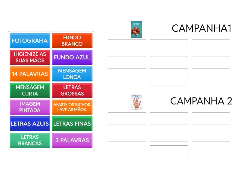 CAMPANHA1: LETRAS BRANCAS, LETRAS FINAS, FUNDO AZUL, IMAGEM PINTADA, 14 PALAVRAS, AFASTE OS BICHOS. LAVE AS MÃOS., MENSAGEM LONGA, CAMPANHA 2: LETRAS AZUIS, LETRAS GROSSAS, FUNDO BRANCO, FOTOGRAFIA, 3 PALAVRAS, HIGIENIZE AS SUAS MÃOS, MENSAGEM CURTA,