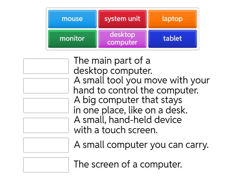 desktop computer - A big computer that stays in one place, like on a desk., laptop - A small computer you can carry., monitor - The screen of a computer. , mouse - A small tool you move with your hand to control the computer. , system unit - The main part of a desktop computer., tablet - A small, hand-held device with a touch screen.,