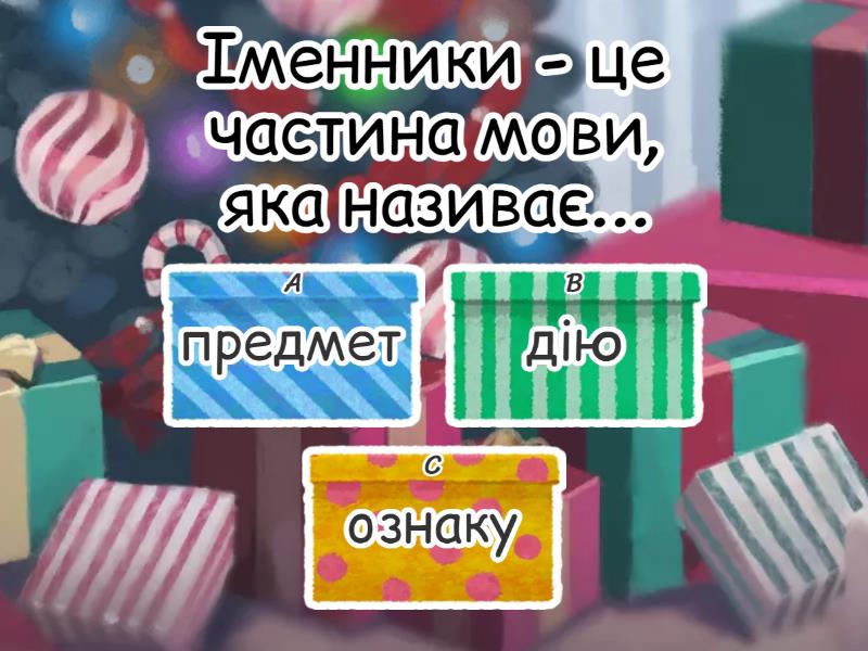 1) Іменники - це частина мови, яка називає... a) предмет b) дію c) ознаку 2) На питання хто? відповідають назви... a) неістот b) істот 3) Назви неістот відповідають на питання... a) хто? b) що? 4) Познач назви істот. a) Данило b) їжак c) сосна d) учень e) Іван Петрович f) бібліотекар 5) Познач назви неістот. a) будівельник b) будівля c) повітря d) річка e) пенал f) лев 6) Власні іменники пишуться ... a) з великої літери b) з маленької літери 7) Де всі іменники записано правильно? a) Петро, озеро Світязь, Кінь Орлик. b) гора Говерла, Мама Марина, Людмила Петрівна c) Леся Українка, місто Львів, Україна, Українці d) річка Дністер, Різдво, папуга Кеша 8) Познач іменники, які вжито в однині a) мандарин b) ножиці c) рука d) ялинки e) молоко f) сніг 9) Познач іменники, вжиті у множині. a) хмари b) шахи c) дитина d) діти e) дерева f) будівлі