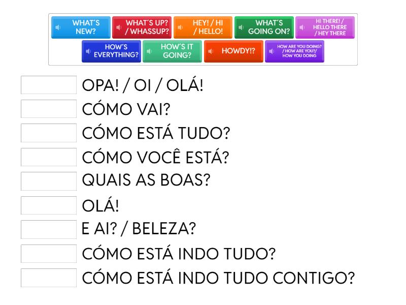 HI THERE! / HELLO THERE / HEY THERE - OLÁ!, HOW ARE YOU DOING? / HOW ARE YOU?/ HOW YOU DOING - CÓMO VOCÊ ESTÁ?, HOWDY!? - CÓMO VAI?, HOW´S EVERYTHING? - CÓMO ESTÁ TUDO?, HOW´S IT GOING? - CÓMO ESTÁ INDO TUDO CONTIGO?, WHAT´S GOING ON? - CÓMO ESTÁ INDO TUDO?, WHAT´S NEW? - QUAIS AS BOAS?, WHAT´S UP? / WHASSUP? - E AI? / BELEZA?, HEY! / HI / HELLO! - OPA! / OI / OLÁ!,