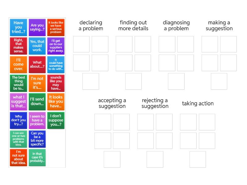 declaring a problem: I seem to have a problem., it looks like we have a serious problem, It looks like you have..., finding out more details: Can you be a bit more specific?, Are you saying...?, Have you tried...?, What about....?, I don't suppose you...?, diagnosing a problem: sounds like you may have..., It could have something to do with..., I'm not sure it's...., In that case it's probably..., making a suggestion: The best thing would be to..., what I suggest is that..., Why don’t you try....?, accepting a suggestion: Right, that makes sense. , Yes, that could work., rejecting a suggestion: I’m not sure about that idea., I can see one or two problems with that idea., taking action: I’ll send down..., I’ll come over., I’ll get on to our suppliers right away.,