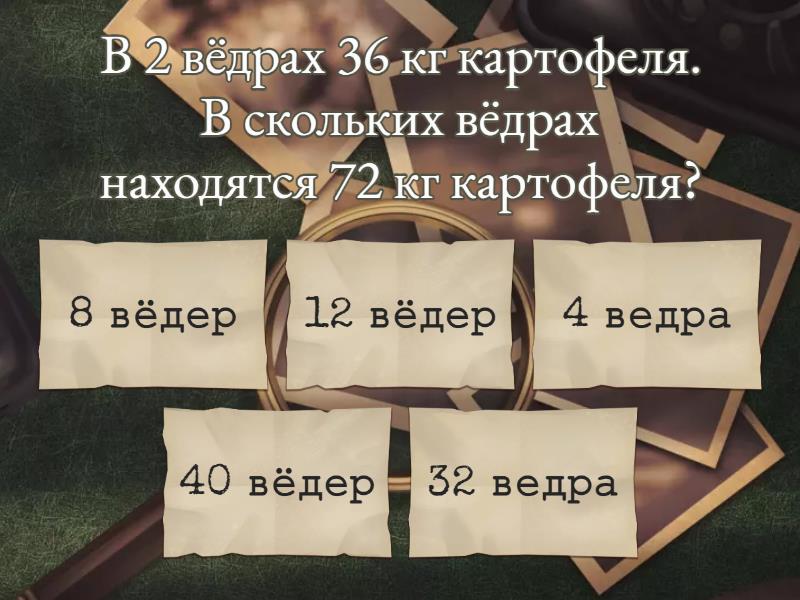 1) В 2 вёдрах 36 кг картофеля. В скольких вёдрах находятся 72 кг картофеля? a) 8 вёдер b) 12 вёдер c) 4 ведра d) 40 вёдер e) 32 ведра 2) В 5 наборах 30 листов цветной бумаги. Сколько листов цветной бумаги в 6 наборах? a) 36 листов b) 18 листов c) 13 листов 3) В магазин привезли 52 кг апельсинов и разложили поровну в 13 пакетов. Сколько потребуется пакетов, чтобы разложить 80 кг апельсинов? a) 6 пакетов b) 20 пакетов c) 15 пакетов 4) На постройку 7 клеток для голубей израсходовали 14 одинаковых досок. Сколько таких досок потребуется, чтобы построить 16 клеток? a) 10 досок b) 18 досок c) 32 доски d) 8 досок 5) Из 10 кусочков меха можно сделать 5 красивых поделок к 8 Марта. Сколько поделок получится из 90 кусочков меха? a) 5 поделок b) 60 поделок c) 12 поделок d) 45 поделок 6) На изготовление 3 одинаковых костюмов израсходовали 42 м ткани. Сколько метров ткани потребуется, чтобы изготовить 4таких костюма? a) 8 метров b) 56 метров c) 20 метров d) 14 метров
