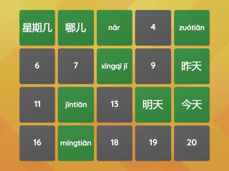 今天 - jīntiān , 昨天 - zuótiān , 明天 - míngtiān , 星期几 - xīngqī jǐ , 哪儿 - nǎr , 那儿 - nàr , 回学校 - huí xuéxiào , 我 - wǒ , 对不起 - duì bu qǐ , 没关系 - méi guānxi ,