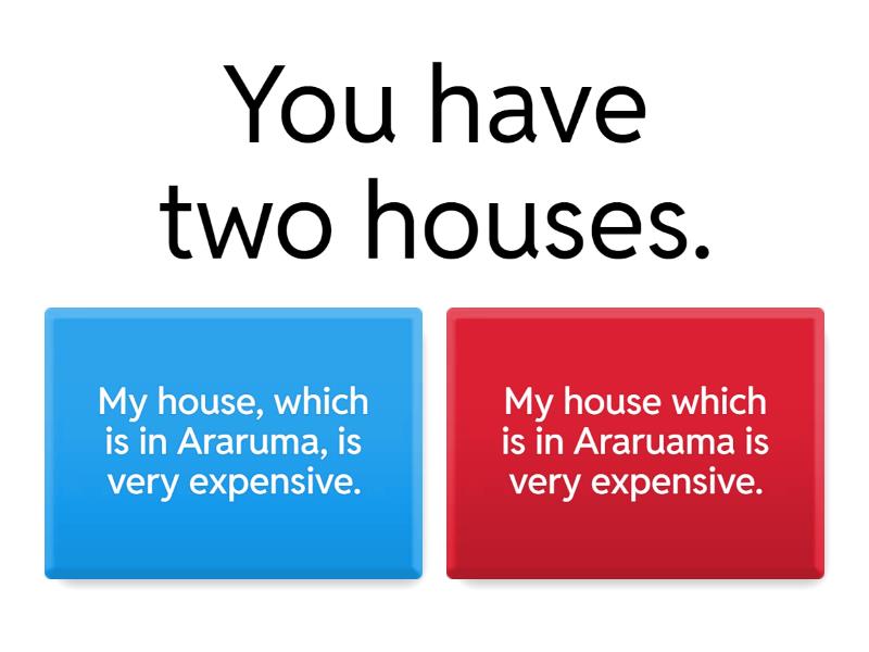 1) You have two houses. a) My house, which is in Araruma, is very expensive. b) My house which is in Araruama is very expensive. 2) You have only one brother. a) My brother, who's a government official, has just got a promotion. b) My brother who's a government official has just got a promotion. 3) You have many pairs of socks. a) The drawer, that I use to keep my socks, has no room for more. b) The drawer that I use to keep my socks has no room for more. 4) There are thousands of museums around the city. a) The museum which we visited last Sunday was my favourite. b) The museum, which we visited last Sunday, was my favourite. 5) You have two friends named Sam. a) My friend Sam who lives in Barcelona just got a new cat. b) My friend Sam, who lives in Barcelona, just got a new cat. 6) You have one computer. a) My computer which is not new has stopped working. b) My computer, which is not new, has stopped working. 7) There are three pictures on the wall. a) The picture which has mountains was taken by me. b) The picture, which has mountains, was taken by me.