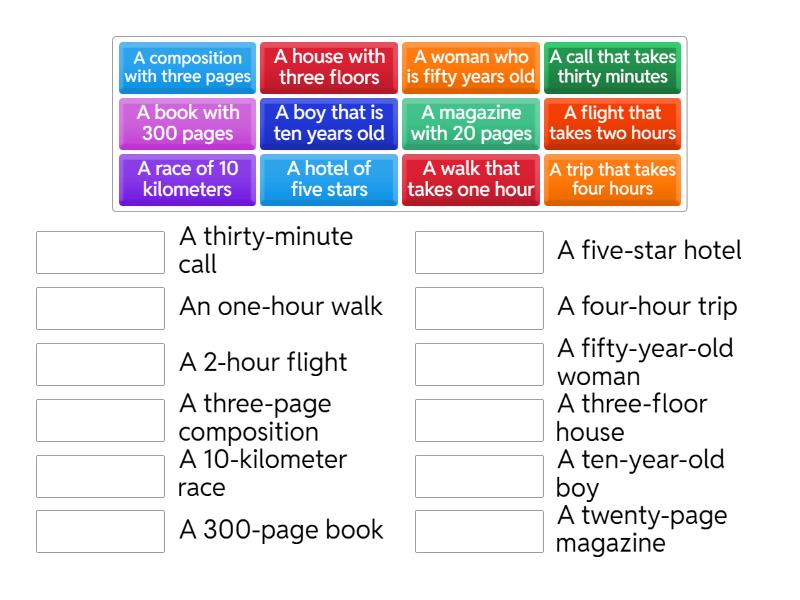 A hotel of five stars - A five-star hotel, A book with 300 pages - A 300-page book, A boy that is ten years old - A ten-year-old boy, A magazine with 20 pages - A twenty-page magazine, A woman who is fifty years old - A fifty-year-old woman , A flight that takes two hours - A 2-hour flight, A race of 10 kilometers - A 10-kilometer race, A house with three floors - A three-floor house, A composition with three pages - A three-page composition, A trip that takes four hours - A four-hour trip, A walk that takes one hour - An one-hour walk, A call that takes thirty minutes - A thirty-minute call,