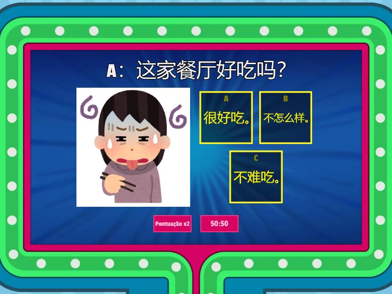 1) A:这家餐厅好吃吗? a) 很好吃。 b) 不怎么样。 c) 不难吃。 2) A:这条裤子怎么样? a) 短了一点儿 b) 刚刚好。 c) 长了一点儿。 3) A:你想买这本书吗? a) 不想,这本书贵了一点儿。 b) 想,这本书便宜了一点儿。 c) 想,这本书好看了一点儿。 4) A:你还好吗? a) 我很好。 b) 不好,今天倒霉得很。 c) 我还好。 5) A:今年的夏天怎么样? a) 热得很。 b) 冷得很。 c) 还可以。 6) A:你觉得汉语好学吗? a) 好得很。 b) 不好学,很容易。 c) 不好学,难得很。 7) 我把眼镜摔坏了。 a) 我的眼镜摔坏了。 b) 我摔眼镜坏了。 c) 眼镜摔坏了我。 8) 他把照片洗好了。 a) 照片洗好了他。 b) 他洗照片好了。 c) 照片洗好了。 9) 你找到我的护照了吗? a) 我的护照找到你了吗? b) 我的护照找到了吗? c) 你我的护照找到了吗? 10) 她写的字真不错。 a) 她的字写得真不错。 b) 写得真不错她的字。 c) 她写真不错的字。 11) 她昨天喝了咖啡。 a) 昨天咖啡喝了她。 b) 咖啡她昨天喝了。 c) 喝了咖啡她昨天。 12) 他昨晚写完了作业。 a) 写完了作业他昨晚。 b) 昨晚作业写完了他。 c) 作业他昨晚写完了。 13) 你找着护照了吗? a) 护照你找着了吗? b) 护照找着了你吗? c) 找着了护照你吗? 14) 你做完工作了吗? a) 工作做完了你吗? b) 工作你做完了吗? c) 做完了工作你吗? 15) 我去过上海。 a) 过上海我去。 b) 上海我去过。 c) 上海去过我。 16) 我读过这本书。 a) 这本书我读过。 b) 这本书读过我。 c) 读过这本书我。 17) 这些照片( )都照得很好。 a) 个个 b) 件件 c) 张张 18) 我们班的同学( )都很努力。 a) 次次 b) 个个 c) 张张 19) 这些苹果( )都好吃。 a) 次次 b) 件件 c) 个个 20) 这些鱼( )都很新鲜。 a) 条条 b) 个个 c) 只只 21) 公园里的花( )都很漂亮。 a) 只只 b) 朵朵 c) 个个 22) 这间餐厅的菜( )都很好吃。 a) 只只 b) 朵朵 c) 道道 23) 有汽车的人一( )比一( )多。 a) 年 b) 只 c) 辆 24) 我一( )比一( )胖。 a) 个 b) 只 c) 天 25) 汉语一( )比一( )难。 a) 次 b) 个 c) 件 26) 头发一( )比一( )长。 a) 个 b) 条 c) 天 27) 天气一( )比一( )冷。 a) 道 b) 天 c) 朵 28) 爸妈一( )比一( )老。 a) 年 b) 道 c) 条 29) 手机一( )比一( )新。 a) 条 b) 天 c) 年 30) 这间餐厅的菜一( )比一( )好吃。 a) 只 b) 道 c) 条