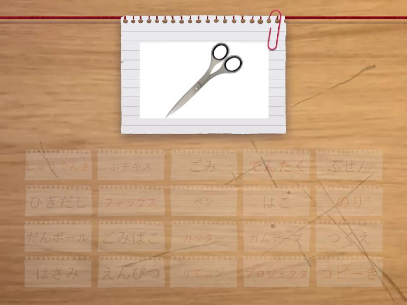 はさみ, カッター, のり, ホチキス, えんぴつ, ペン, でんたく, じゅうでんき, ふせん, だんボール, ごみ, プロジェクタ, リモコン, ひきだし, ガムテープ, はこ, ファックス, コピーき, つくえ, ごみばこ,