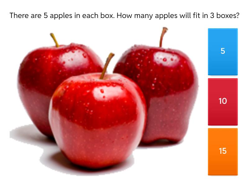 1) There are 5 apples in each box. How many apples will fit in 3 boxes? a) 5 b) 10 c) 15 2) Júlia has a collection of 12 bows, and her sister Juliana has twice as many. How many bows does Juliana have? a) 24 b) 14 c) 34 3) I have 5 packs of candy, with 5 candies in each pack. How many candies do I have? a) 10 b) 25 c) 15 4) I have 4 shelves in my room, with 7 toy cars on each. How many toy cars do I have? a) 11 b) 47 c) 28 5) In a chicken coop, there were 4 chickens, and each chicken lays 3 eggs per day. How many eggs do they lay together in one day? a) 7 b) 12 c) 9 6) An ice cream vendor sold 18 ice creams in three days. How many ice creams did he sell per day? a) 6 b) 18 c) 9