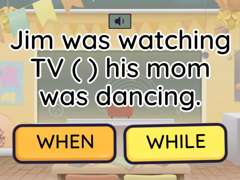 1) Jim was watching TV ( ) his mom was dancing. a) WHEN b) WHILE 2) She was walking to school ( ) it started to rain. a) WHEN b) WHILE 3) We were playing in the park ( ) we saw a big bird. a) WHEN b) WHILE 4) He was reading a book ( ) his sister was listening to music. a) WHEN b) WHILE 5) They were eating lunch ( ) John was taking a shower. a) WHEN b) WHILE 6) I was doing homework ( ) my brother was playing video game. a) WHEN b) WHILE 7) The baby was sleeping ( ) the dog barked. a) WHEN b) WHILE 8) We were swimming in the pool ( ) dad arrived. a) WHEN b) WHILE