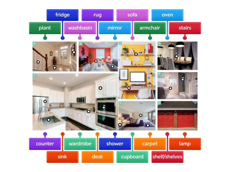 mirror, stairs, carpet, armchair, sofa, fridge, cupboard, sink, counter, oven, shelf/shelves, desk, plant, washbasin, shower, wardrobe, lamp, rug.