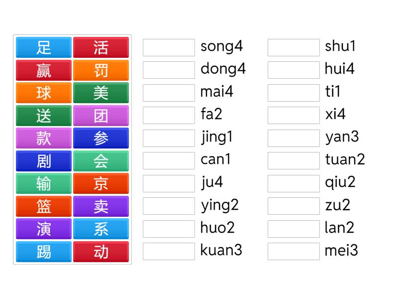球 - qiu2, 篮 - lan2, 踢 - ti1, 足 - zu2, 系 - xi4, 输 - shu1, 赢 - ying2, 京 - jing1, 剧 - ju4, 演 - yan3, 会 - hui4, 团 - tuan2, 参 - can1, 活 - huo2, 动 - dong4, 卖 - mai4, 送 - song4, 美 - mei3, 罚 - fa2, 款 - kuan3,