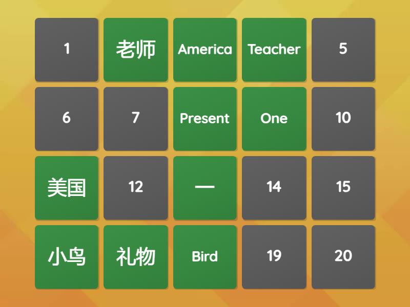 Present - 礼物, One - 一, Bird - 小鸟, America - 美国, Teacher - 老师, School - 学校, China - 中国, JJ Lin - 林俊杰, Yellow - 黄色, Dragon Boat Race - 赛龙舟,