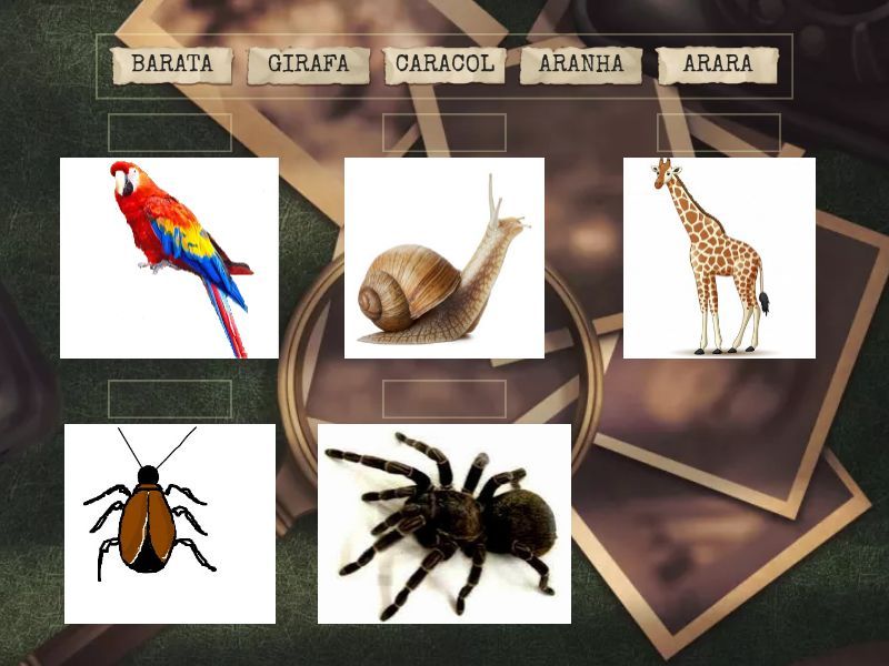ARARA, CARACOL, GIRAFA, BARATA, ARANHA, TUBARÃO, CORUJA, CANGURU, GORILA, PERIQUITO,