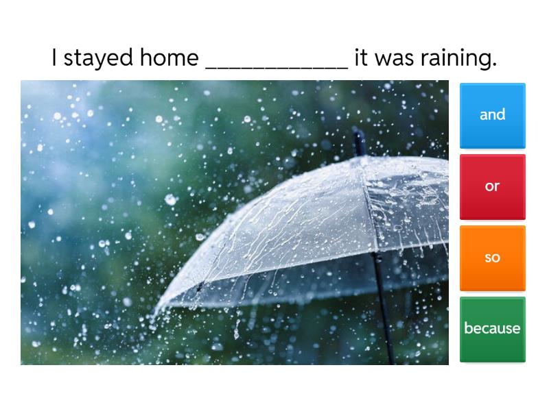 1) I stayed home ____________ it was raining. a) and b) or c) so d) because 2) I like apples ________ bananas. a) because b) so c) and d) but 3) He was tired, ______ he went to bed early. a) so b) because c) but d) and 4) I am tall _____ my brother is short a) but b) so c) or d) and 5) Do you want tea ______ coffee? a) and b) or c) because d) so 6) She is happy _________ she passed the test. a) so b) and c) because d) or 7) He plays basketball _____ soccer a) so b) but c) because d) and 8) It was hot ______ I went to the beach a) so b) because c) and d) or 9) I wanted to go ____ my car broke. a) and b) because c) or d) but 10) Do you prefer blue ______ black? a) but b) because c) or d) and