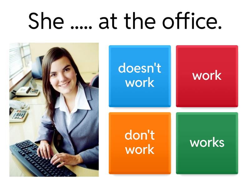 1) She ..... at the office. a) doesn't work b) work c) don't work d) works 2) My father ..... ....... cigarettes. (NOT) a) smokes b) smoke c) doesn't smoke d) don't smoke 3) I .... .... meat. (NOT) a) doesn't eat b) don't eat c) eat d) does eat 4) We ..... to the radio. a) live b) listen c) drink d) listens 5) Alice and Mark .... ..... in London. (NOT) a) isn't living b) doesn't live c) don't live d) lives 6) You ..... to the cinema at weekends. a) go b) play c) goes d) plays 7) A teacher ________ in a school.  a) doesn't work b) work c) don't work d) works 8) A builder ________ on a building site.  a) don't work b) works c) doesn't work d) work  9) A waiter _________ in a shop. a) works b) work c) doesn't work d) don't work